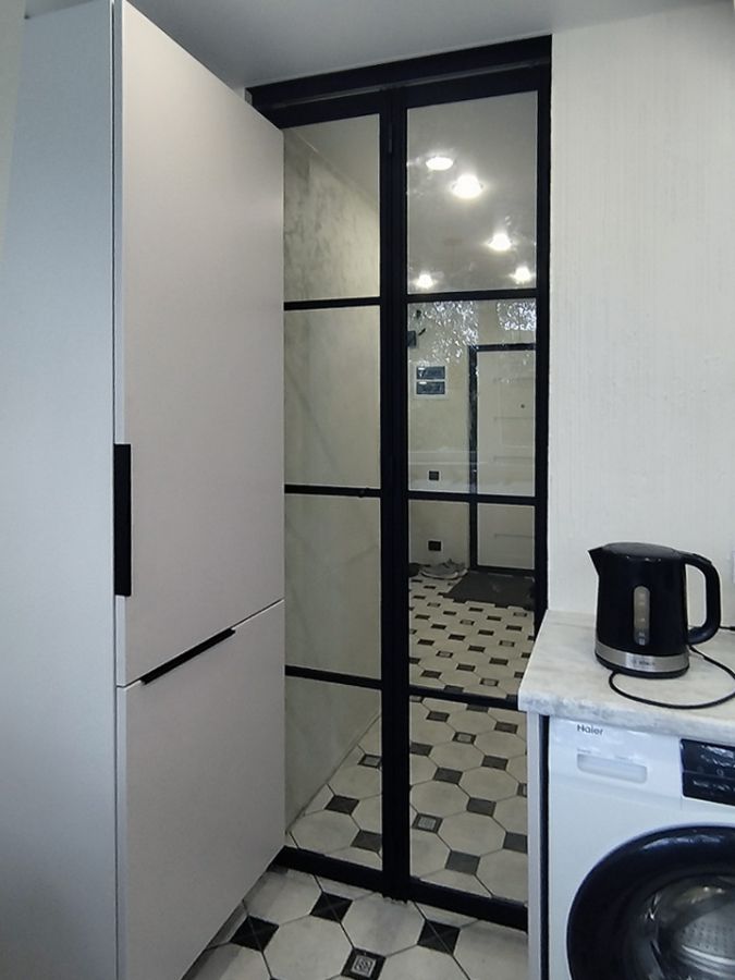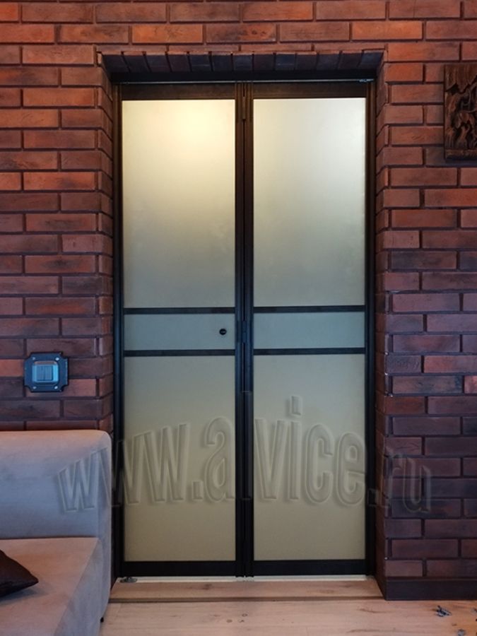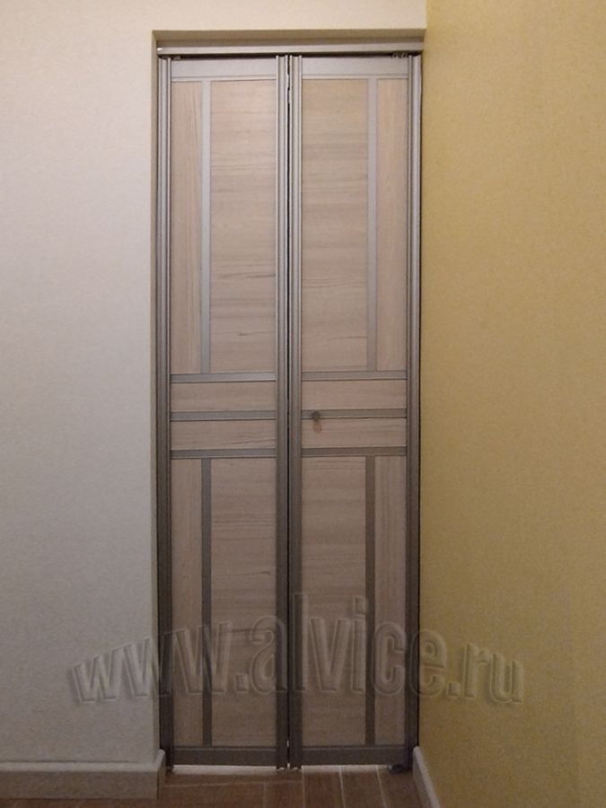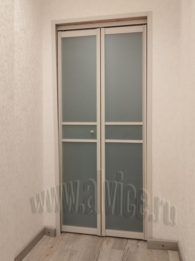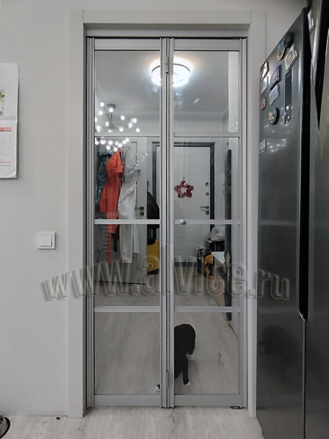 Складная дверь-книжка межкомнатная (для кухни) из 2-х створок в AL профиле. Более десятка вариантов отделки/цвета профиля; наполнение - ЛДСП 10мм/стекло 4мм. Для проемов шириной 600 - 1000 мм и высотой до 2700 мм.