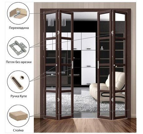 Складная перегородка-книжка из 4-х створок в каркасе из МДФ профиля со сложением в обе стороны и "французским" остеклением.
